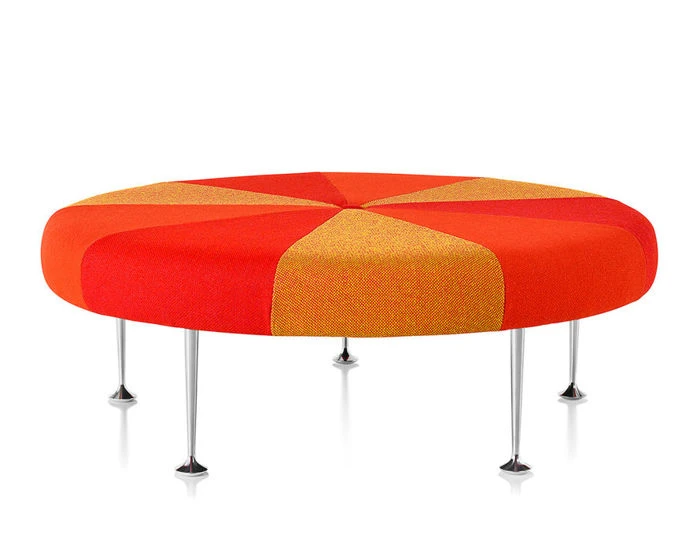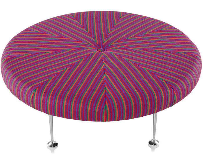 Playful, colorful, and graphic, the Girard Color Wheel Ottoman is unmistakably the work of Alexander Girard. Available in an array of bold colors, or distinctive stripes, this low upholstered piece serves equally well as a footrest, coffee table, extra seat, or conversation starter.