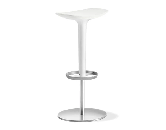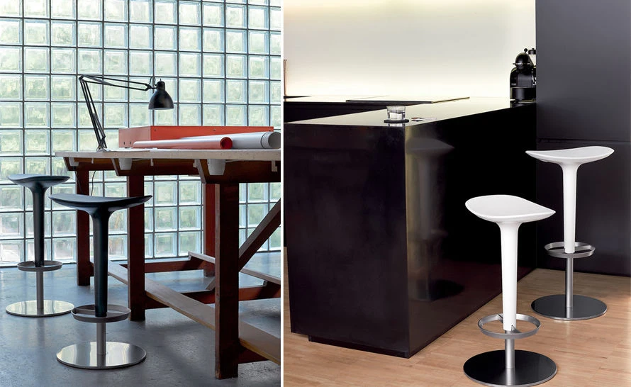 A simple, almost intuitive, form. Babar exudes a playful, sophisticated air that belies its technical complexity and functional breadth. Fixed polyurethane seat is available in a range of color combinations. Offered with either a chromed or brushed stainless steel base and height-adjustable. Models without upholstery and backrest have obtained the Environmental Product Declaration (EPD) certification.
