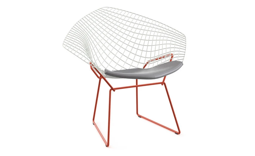 Now you can personalize a Knoll classic. The Bertoia Two-Tone Diamond Chair is offered in twenty different frame color combinations of polished chrome, black, blue, orange red and white. Please note: Two-Tone Diamond chairs are not approved for outdoor use. Screws that attach the base to the basket are not painted to match the basket finish. Includes 4 plastic floor glides.