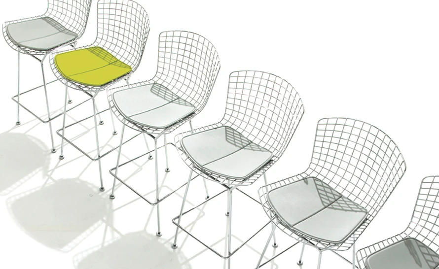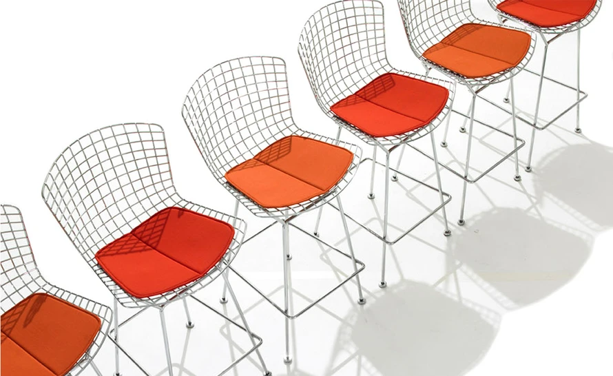 Harry Bertoia’s 1950 experiment with bending metal rods into practical art produced a revered collection of seating, including the exquisite Bertoia stool. Innovative, comfortable and strikingly handsome, the chair’s delicate appearance belies its strength and durability. In Bertoia’s own words, “If you look at these stools, they are mainly made of air, like sculpture. Space passes right through them.”
