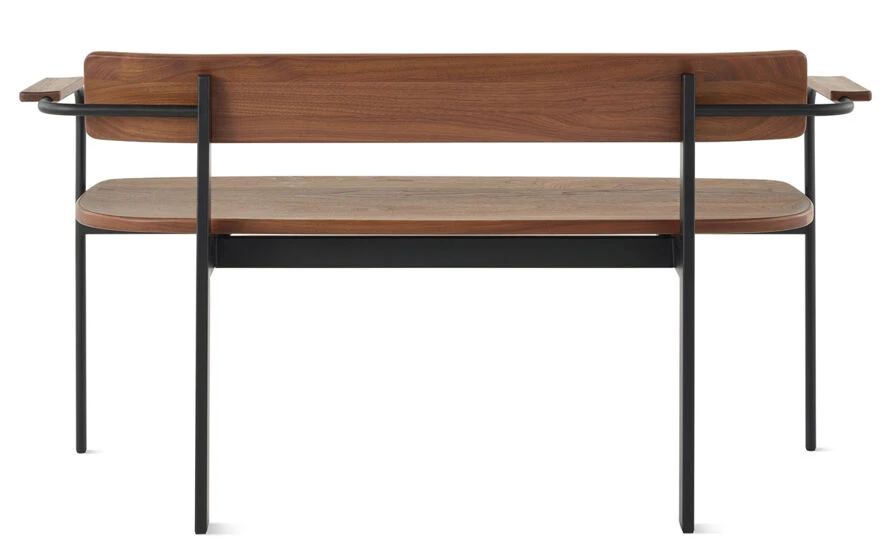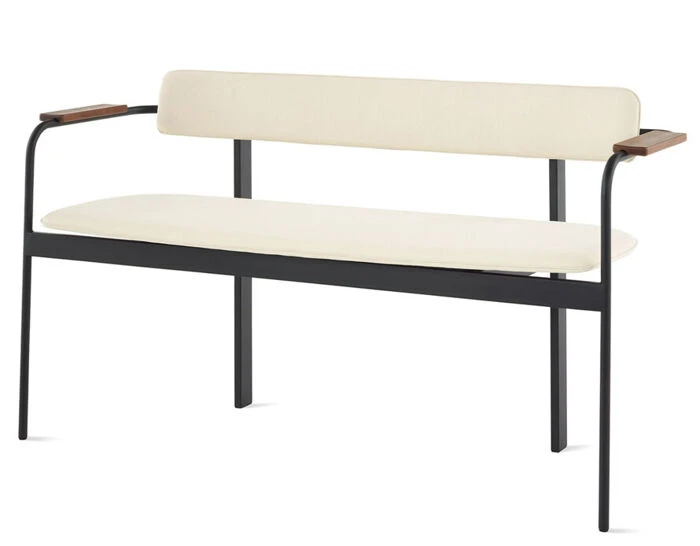 The Betwixt bench with arms has a steel tube frame with a choice of solid wood or upholstered seat and back. The Arms are offered in solid oak or walnut. Bench includes polymer glides suitable for multiple floor surfaces.