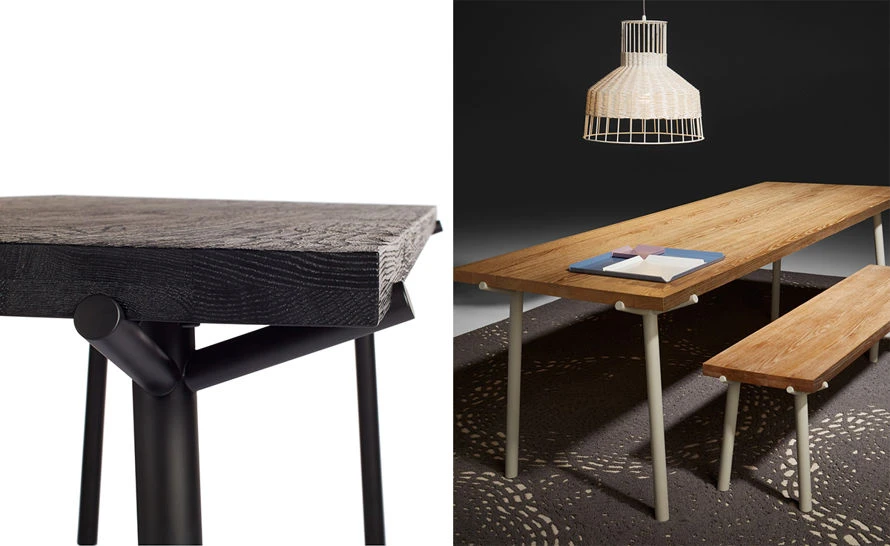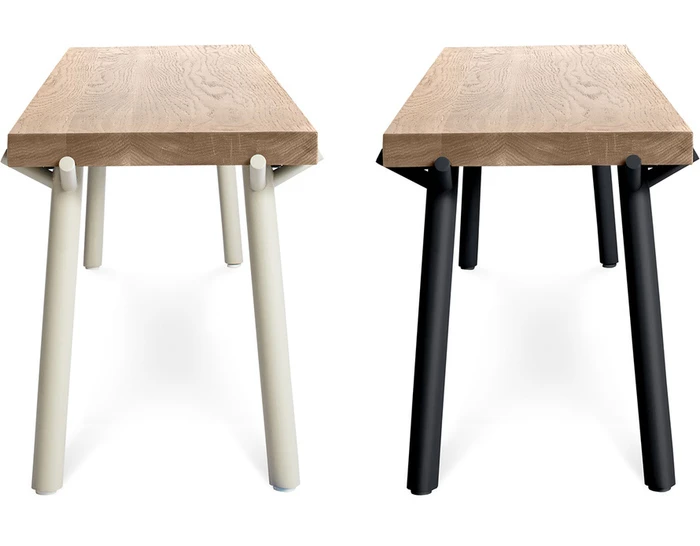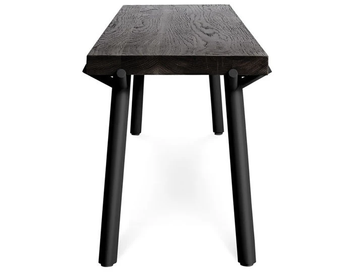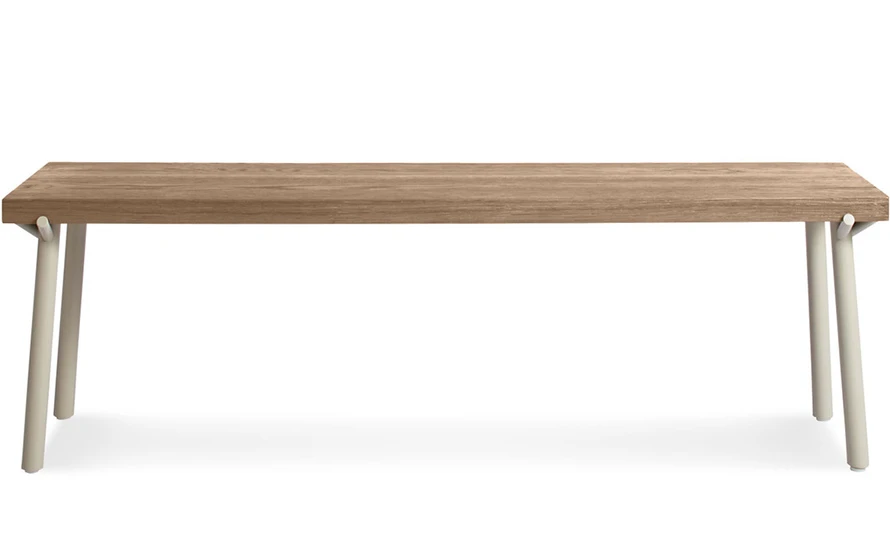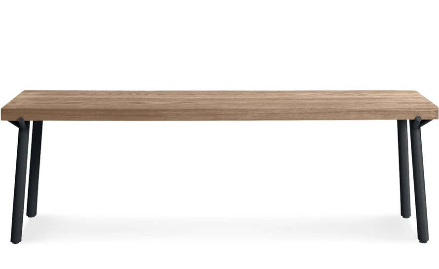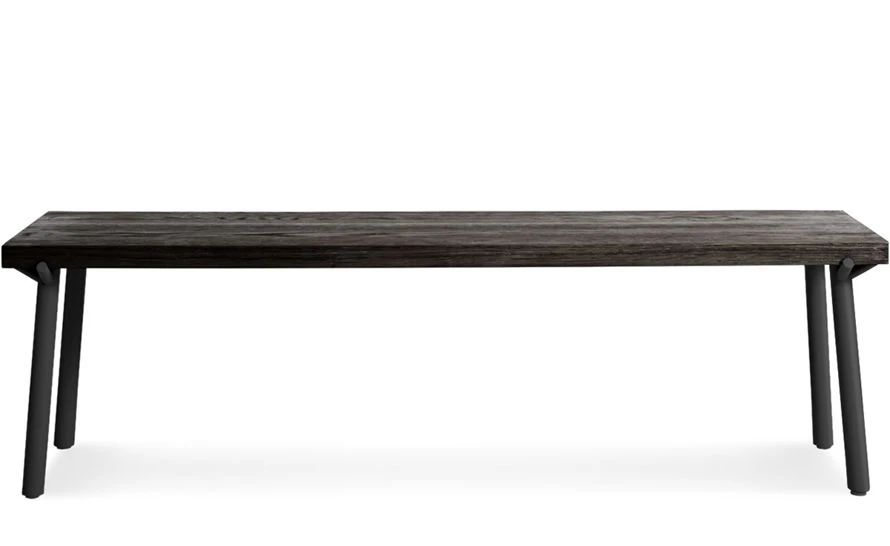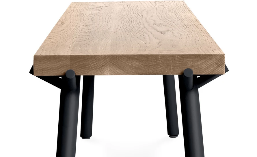 The Branch wood bench features a solid weathered oak top and powder-coated steel legs.