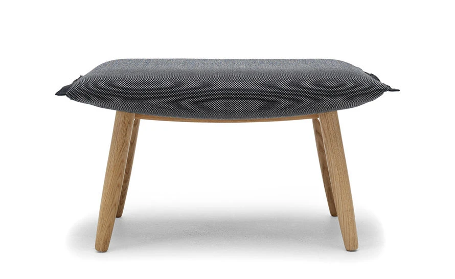 The Embrace footstool fuses a wooden structure and soft upholstery to create an elegant ottoman that is so expressive that it can function as a stand-alone piece as well.