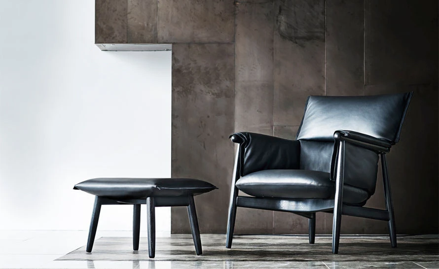 The footstool’s frame is crafted from wood. The piece is particularly striking, its simplicity emphasizing the elegant craftsmanship. The comfortable upholstery embraces the wooden structure and matches perfectly with the lounge chair.