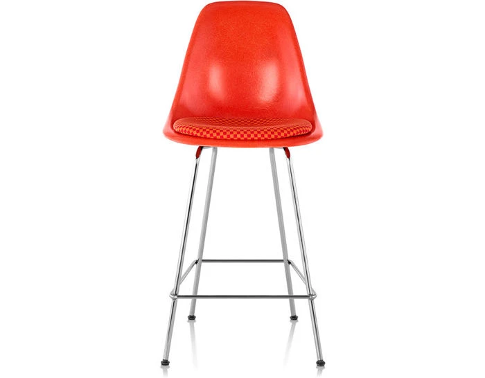 The Eames stools represent the evolution of Charles and Ray Eames’ iterative process, which continually pushed the boundaries of what a single-shell chair could be. The seat and back are formed of a single piece of molded fiberglass with waterfall edges. The Eames fiberglass stool is offered in a choice of base colors and the shell can be specified in a variety of archival colors. The fiberglass shell can also be upholstered in an array of textiles. Black and chrome 4-leg bases are provided with black glides while the white 4-leg base has white glides. The upholstered seat pad comes affixed to the Eames molded shell and available in a variety of fabric or leather upholstery options.