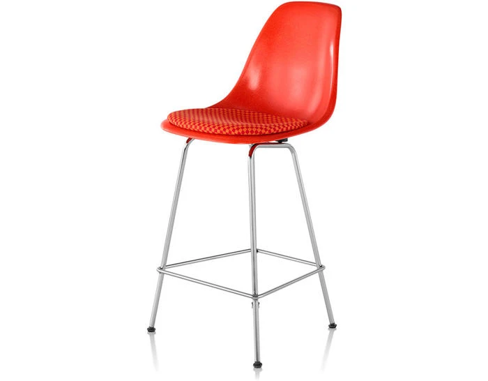 The familiar form of the Eames Molded Fiberglass shell sits atop a 4-leg base design that makes it an ideal seating option at bar- or counter-height surfaces. Thanks to advances in safe fiberglass composition, the Eames’ distinctive single-shell form is safely produced by means of a less volatile, monomer-free “dry bind” process. The process for making shells and the nature of fiberglass give each shell unique character traits that may include some surface cavities, areas of lighter or darker color, or faint circular shadows where stool base is attached to shell.