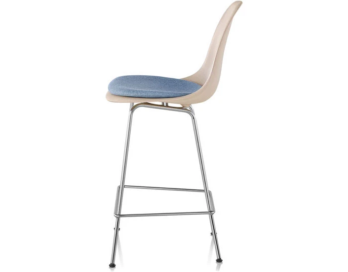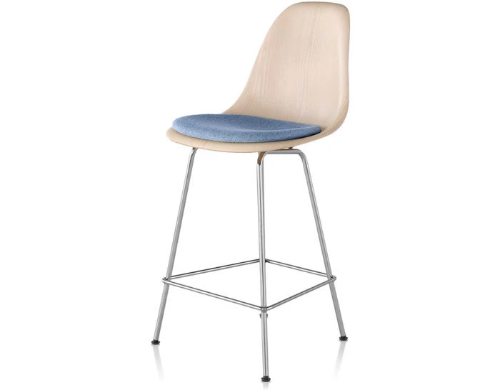 The authentic form of the Eames stool is the result of a process that gives wood veneer the extra flexibility it needs to be molded into the complex curves of a single-from wood shell. The result brings a touch of style to any setting. Eames Molded Wood Stools are available in several veneers. The 4-leg base comes in bar- or counter-height, and offers its own choice of finish options. Black and chrome 4 leg stools have black glides while the white stool has white glides. The upholstered seat pad comes affixed to the Eames molded shell and available in a variety of fabric or leather options.