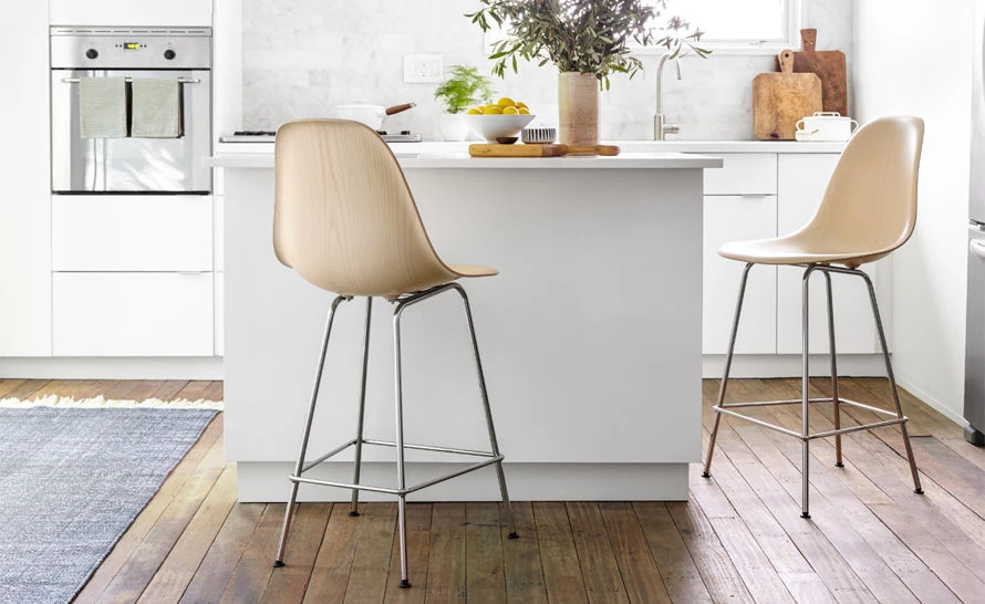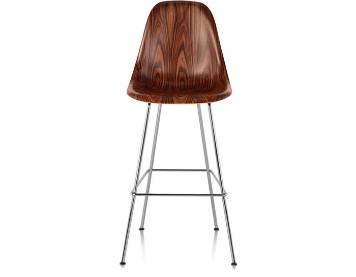 The authentic form of the Eames stool is the result of a process that gives wood veneer the extra flexibility it needs to be molded into the complex curves of a single-from wood shell. The result brings a touch of style to any setting. Eames Molded Wood Stools are available in several veneers. The 4-leg base comes in bar- or counter-height, and offers its own choice of finish options. Black and chrome 4 leg stools have black glides while the white stool has white glides.