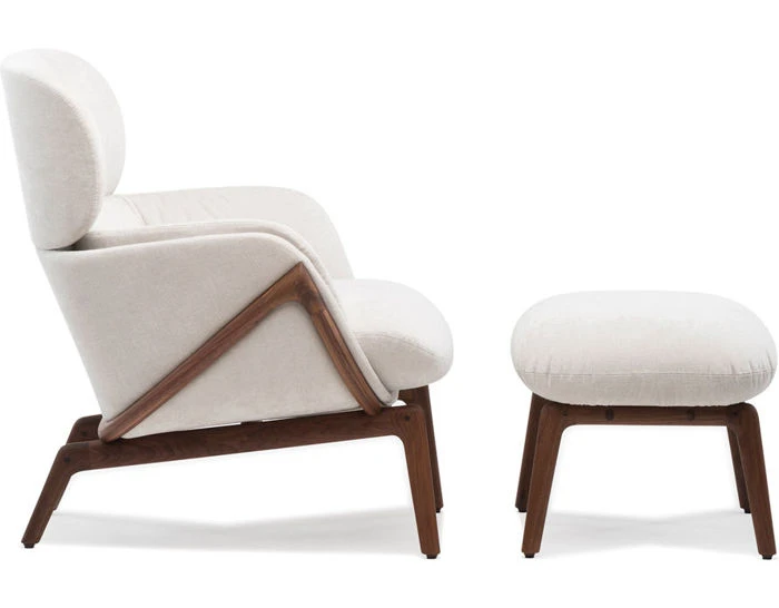 Available in American black walnut, American white oak, or European Ash in a range of finishes, and a range of fabric and leather options. Includes matching Nino ottoman.