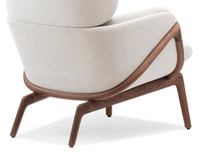 The perfect synthesis of superior woodwork and fine tailoring is revealed in Elysia. The lounge chair has a solid wood leg construction that cradles the padded shell of the seat and the backrest. The “skeleton”, traditionally hidden inside the upholstery, is deliberately exposed to showcase the craftsmanship and premium timber. The exceptional comfort Elysia offers is visually communicated through the padding enveloping the shell, and the generous folds of fabric on the cushion.