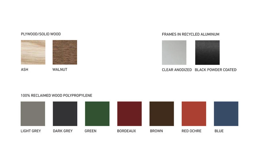 Recycled aluminum, reclaimed polypropylene, plywood or upholstered