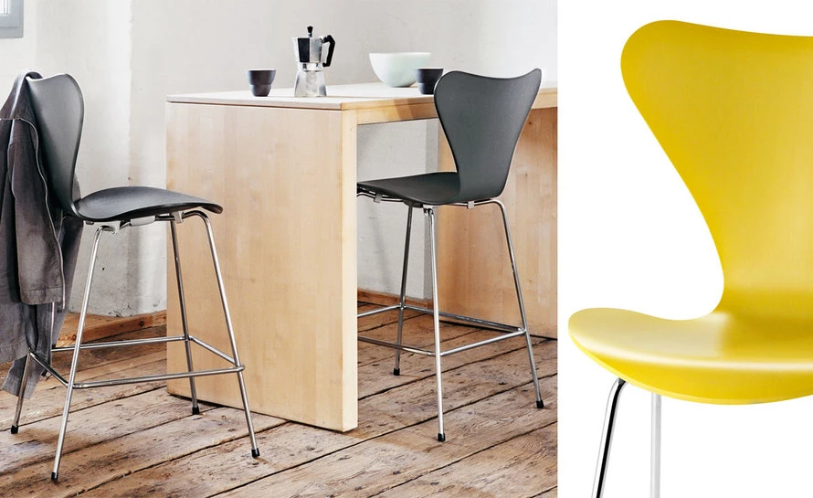 A multipurpose range of chairs, the Series 7 by Arne Jacobsen is the flagship of Fritz Hansen’s collection. Consisting of a slim shell which is composed of 9 layers of veneer plus 2 layers of cotton textile and rests on a thin mirrored chrome steel base. The lamination process coupled with the qualities inherent in the wood make the Series 7 flexible enough to adjust to the body’s contours and movements. Series 7 is available as a stackable side chair, pedestal chair, office chair, barstool or counter stool and as a children’s chair. With a plethora of options and offerings, you’re sure to find the perfect Series 7 chair for any space.