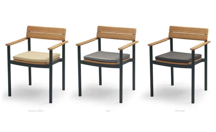 Pelagus Armchair epitomizes the spirit of the Pelagus collection, a series created with grace and sociability in mind and a contemporary expression in which the materials speak for themselves. High on comfort for long dinners, the armchair has wide wooden armrests that form part of the structure, while still being slender enough to group around a table. The wooden armrests are contoured so the armchair can be stacked in twos.