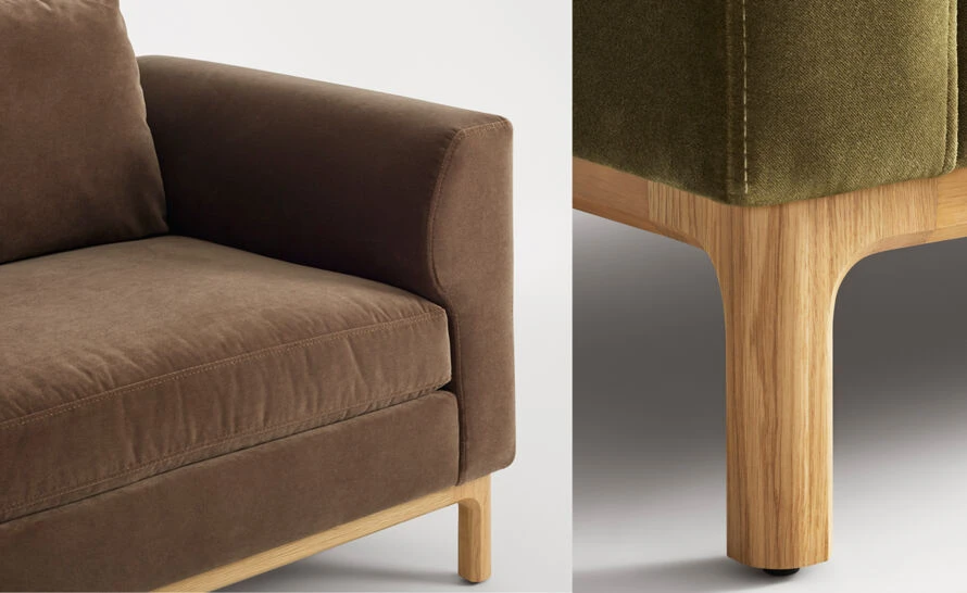 Solid hardwood and wood frame, walnut or oak, high resiliency foam, upholstery