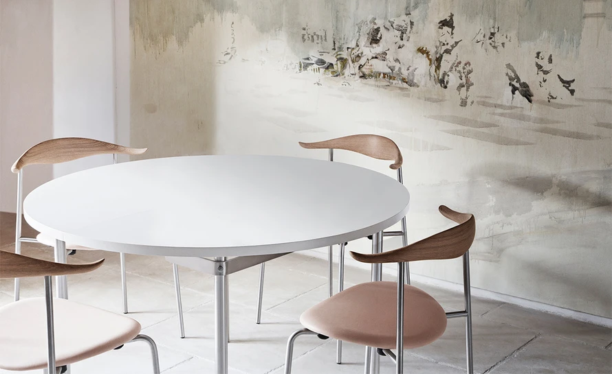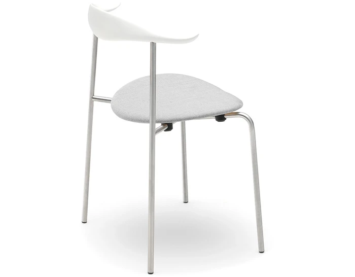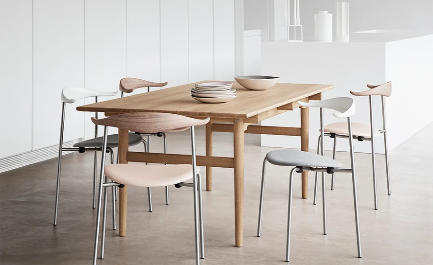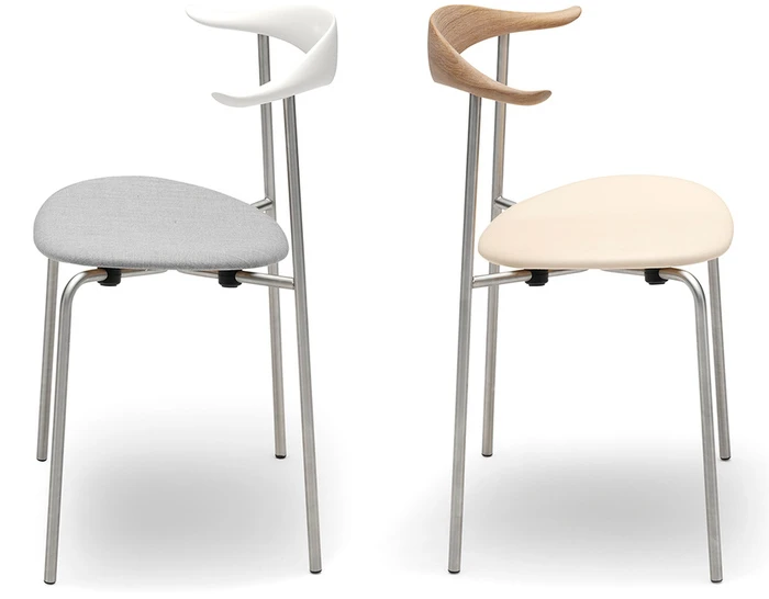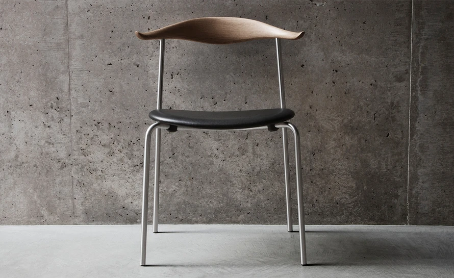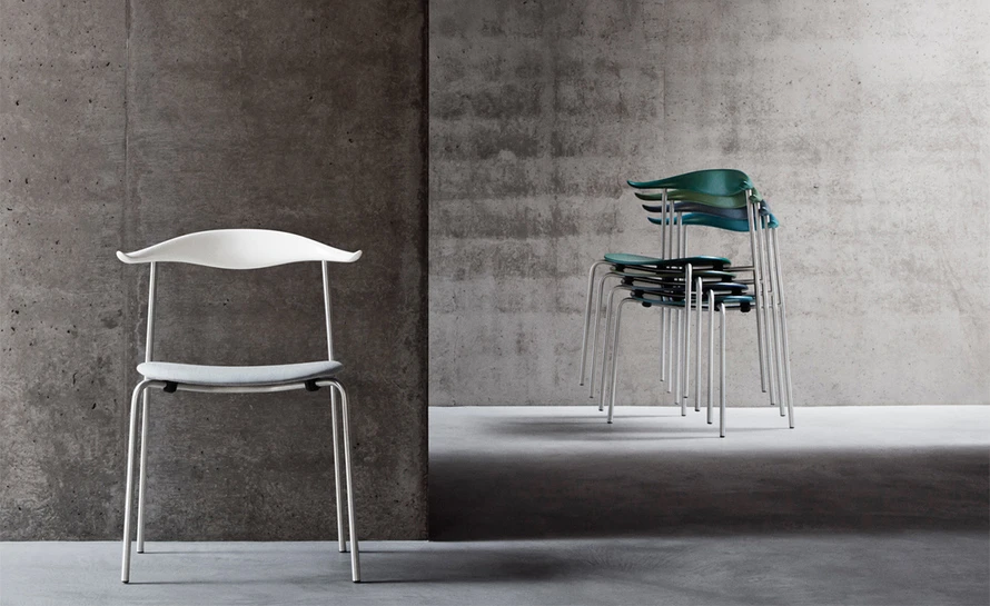 The CH88P is versatile both in terms of its appearance and usability thanks to its numerous finish, frame, and room placement options. Characteristically, the upper structure features a steam-bent wooden backrest for back support, with slight curvatures of the backrest’s ends providing a natural resting place for the arms. The steel frame, with straight back legs, supports an oval-shaped wooden seat. This blend of materials, combined with a minimalist design, results in a light, organic, industrial expression. And the new, stackable design (stackable up to 4 chairs) offers a valuable benefit. The CH88 is available in beech and oak in a range of finishes. The frame is available in stainless steel, powder coated or chrome, and the seat with optional leather or textile upholstery.