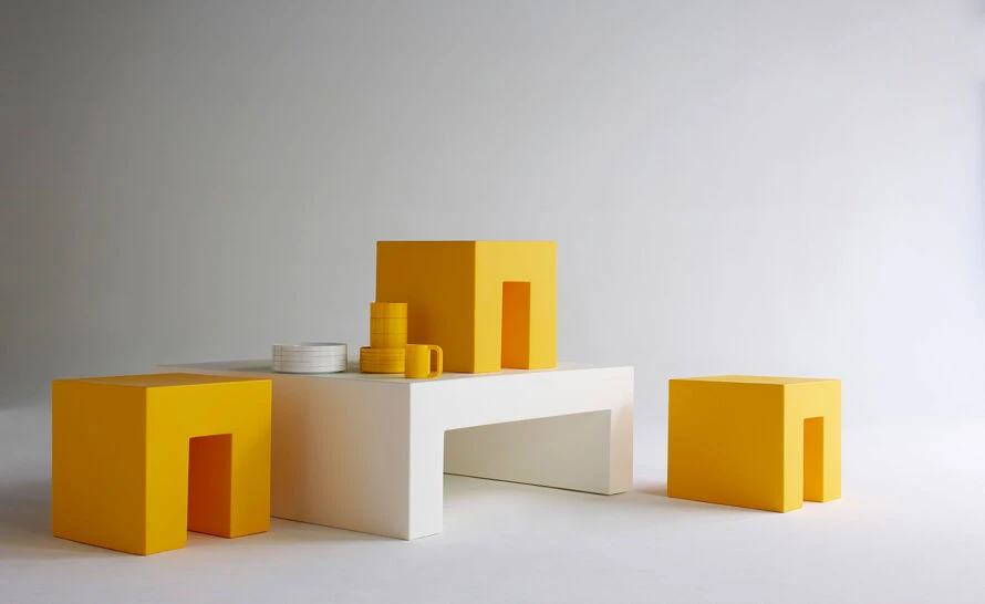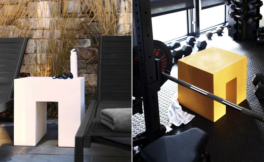 The Vignelli cube is offered in a variety of color options. The collection is completed by the low table & bench.