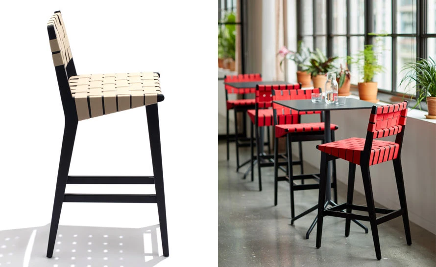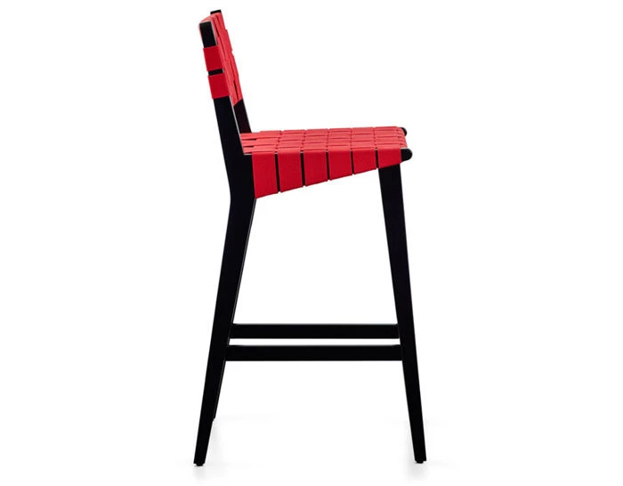 Risom stool frame features select maple or walnut hardwood with clear finish. Ebonized finish is stained maple hardwood. Mortise and tenon construction. Include die-cast aluminum footcap. Also available with a wood back and in an outdoor version.