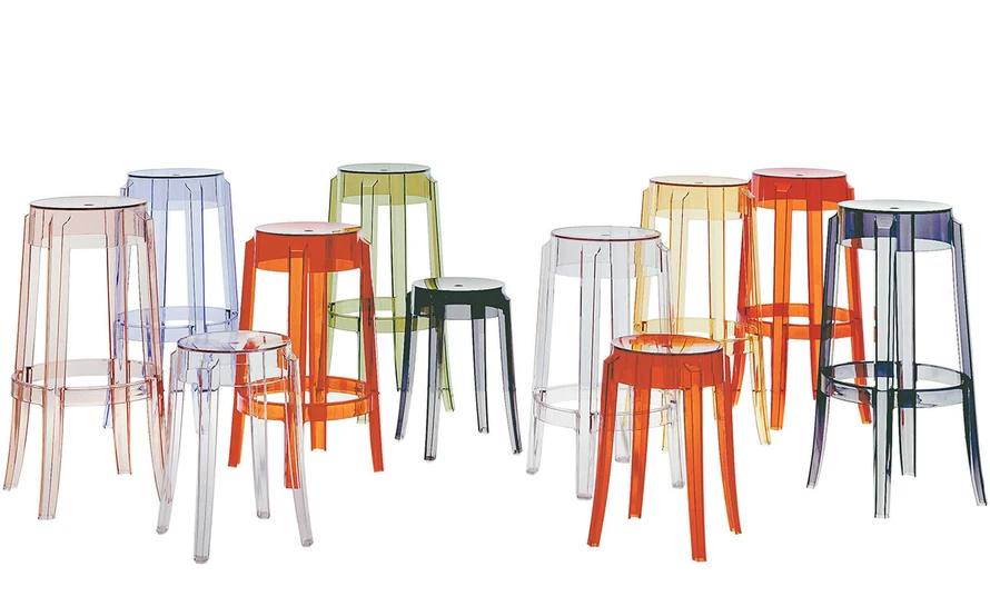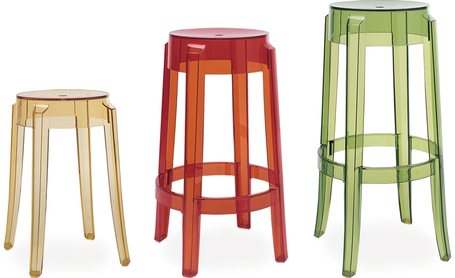 Transparent stools with a strong design appeal. The shape recalls the furniture of the 1800’s, with the slightly curved, rounded leg. With a distinct look and elegant lines, Charles Ghost is a transparent polycarbonate monobloc, which is indestructible and can be used anywhere.