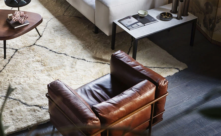 The LC3 features four unconnected cushions, enclosed in a painted or chrome steel tube cage that constitutes the primary support system. The separation of the metal frame and the cushions expresses a rationalist approach to industrial production.