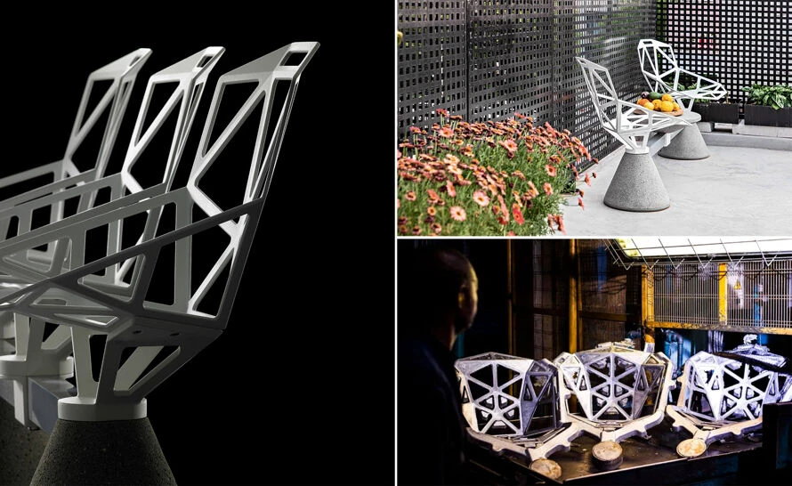 The public seating system consists of a clear coat concrete base with a die-cast and powder coated aluminum seat. Available with variable seating options and optional concrete table. The Chair One family is extremely versatile, and suitable for indoor and outdoor use.