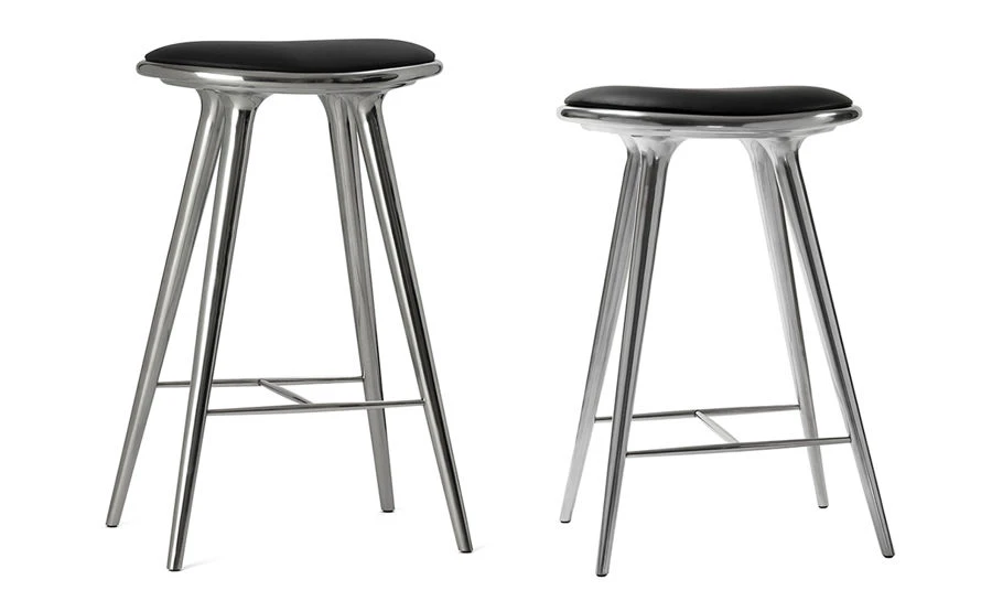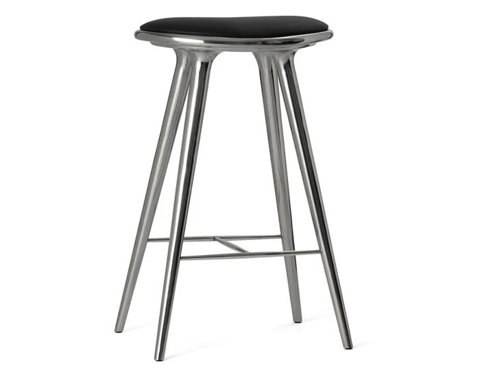 The recycled aluminum high stool is offered with a black Italian leather seat. It is available in both bar height and counter height. Also available as the low stool.