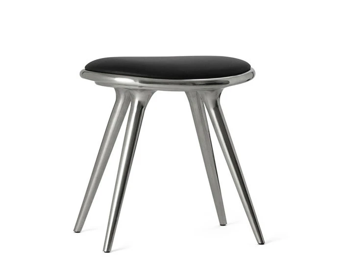 The recycled aluminum low stool is offered with a black Italian leather seat. Also available as the High stool.