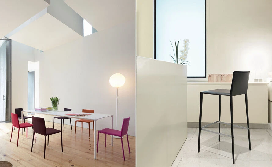 Like a child’s drawing of a chair, Norma expresses its very essence: simplicity, lightness, linearity. Its formal purity is brightened by vibrant colors, natural materials, fresh details and exposed stitching.