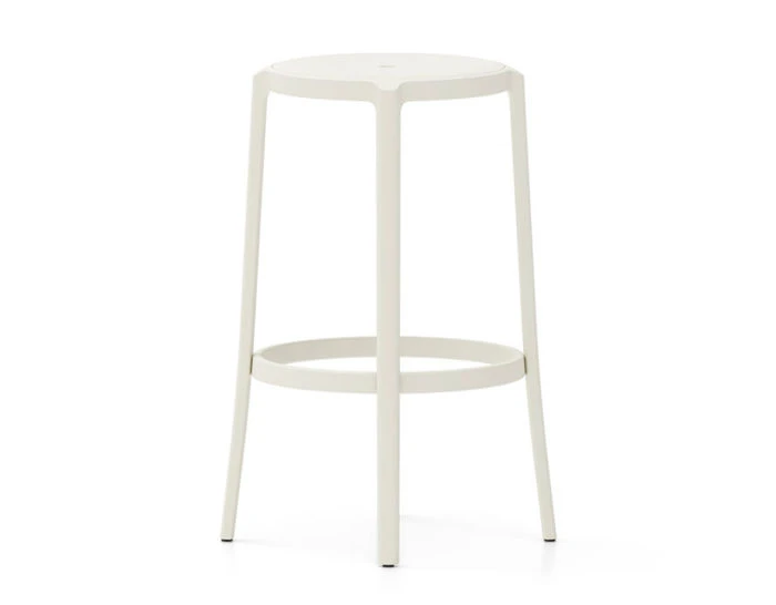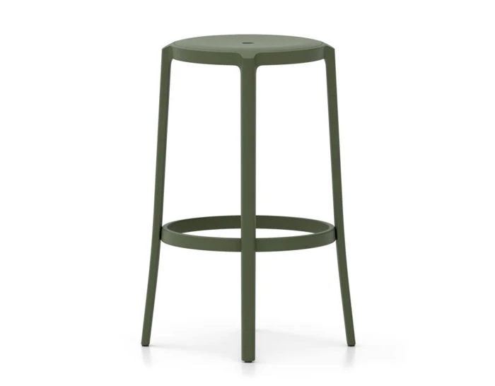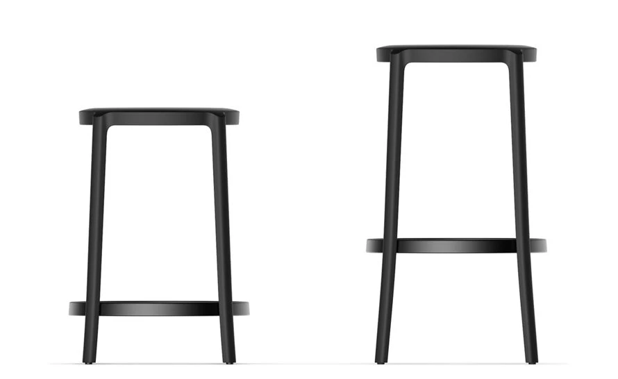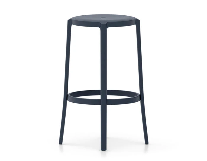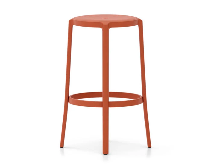 The On and On collection is offered in a variety of seat materials, for different settings and purposes. The rPET seat versions – matching the chair and stool frames – are available in six crisp, timeless colors suitable for both indoor and outdoor spaces. Plywood seats in oak or ash, and upholstered seats, offer a different appeal for interiors. The stools are available in two heights – bar stool height and counter height. Chairs with rPET or plywood seats stack 7 high, and chairs with upholstered seats stack 6 high.