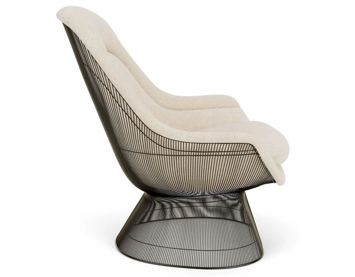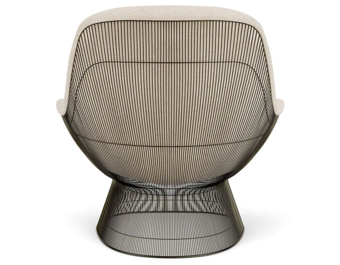 The Platner seating collection features vertical steel wire rods welded to circular horizontal and edge-framing rods. The frame base has a clear plastic extrusion ring for a smooth bottom surface. The seat is a molded fiberglass shell with highly resiliant molded urethane foam cushions. Seat cushion utilizes the same highly resilient molded urethane foam cushion. This collection is offered in your choice of either bright nickel with clear lacquer frame, painted bronze metallic frame or 18K gold plated with clear lacquer frame. Please call the hive showroom with any questions: 1-866-663-4483.