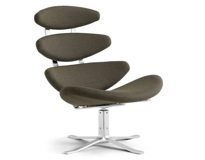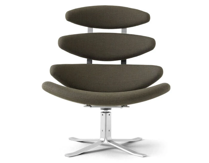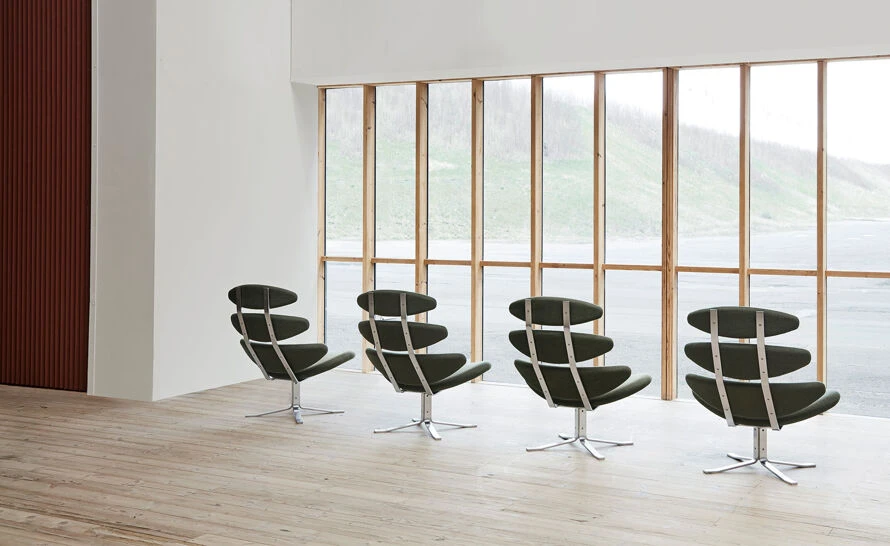 When Poul M. Volther created Corona in 1964 the chair was an obvious hit. Corona was light yet had a sculptural gravity that was not easily forgotten. This combination made Corona a star in countless movies, fashion series and music videos; in fact, Corona probably has the most impressive stage career of all Erik JĆørgensen’s products. Corona’s success is partly due to its fusion of technical cool and warm and inviting form that refers directly to the human anatomy with its spine and ribs.