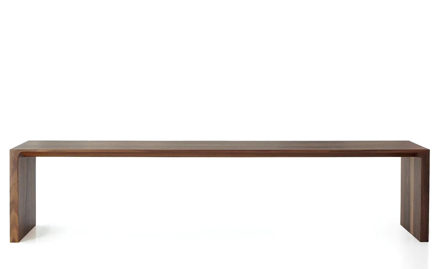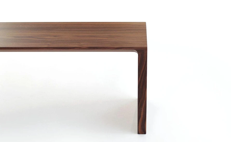 The benches feature the same signature detail as the tables; a thin bevelled edge that cleverly flows through radius cuts to blend with the graceful legs. This sculptural detail gives visual lightness to the top while emphasizing the mass and durability of the bench. The beauty and substantial feel of the thick solid wood material further add to the sense of luxury the benche’s simplicity impart.