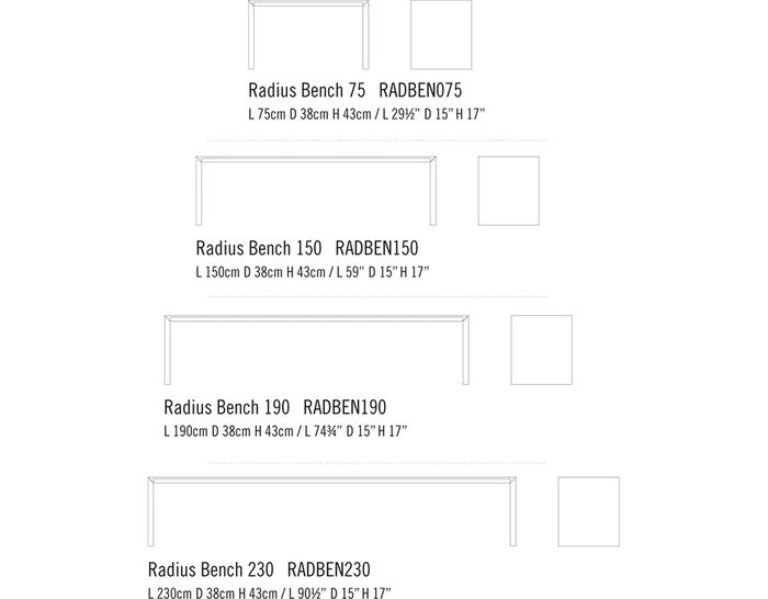 The Radii benches are an addition to the Radii dining table collection, intended as bench seating to match the tables. Together they create the most essential and simple of dining settings, although they are equally appropriate for use in a hallway, waiting room, gallery, bedroom, or even as coffee tables.