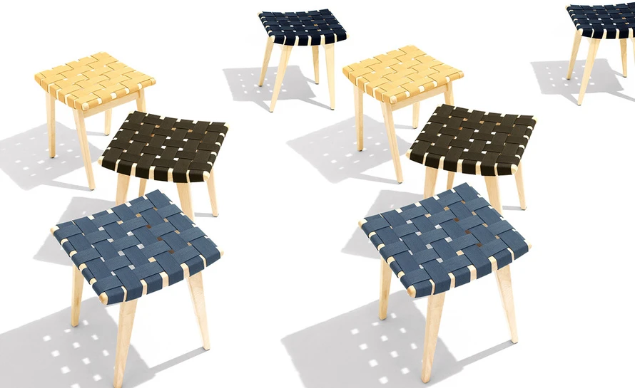 Risom low stool frame is offered in your choice of light walnut or select, clear maple hardwood with clear or ebonized finish. Mortise and tenon construction. Upholstery; 100 percent natural cotton webbing available in ten colors. Nylon webbing (60 percent nylon, 40 percent cotton, with a stain-protective finish) is available in six colors.