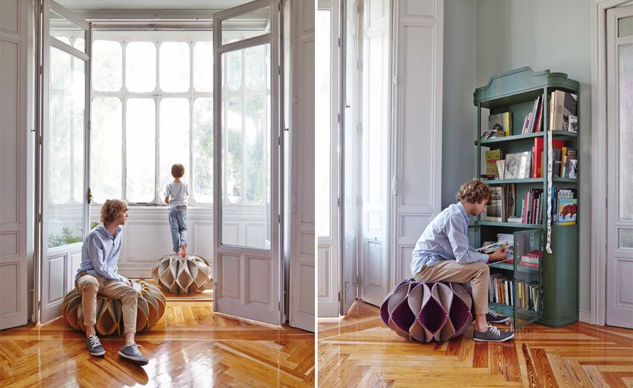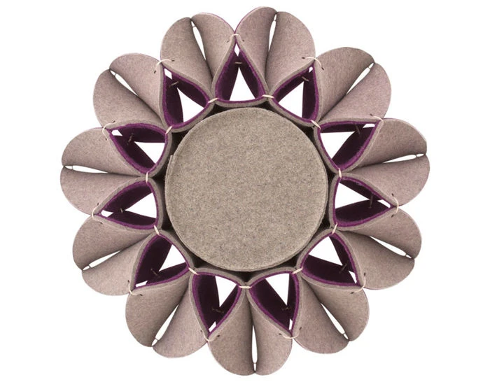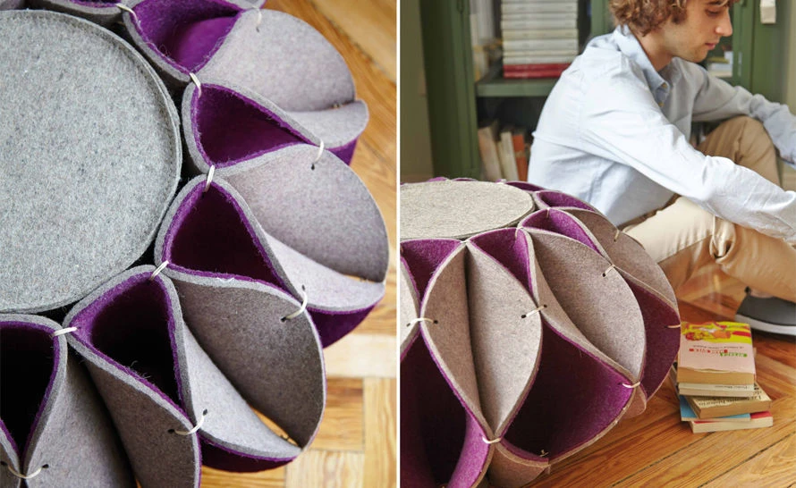 The Ruff Pouf series is composed of pouf-like elements with a voluminous ornament in the style of Elizabethan collars. This is the High pouf, made with felted wool. These poufs can be used as a seat in a living room or dressing room, as a footrest, or even as an occasional side table.