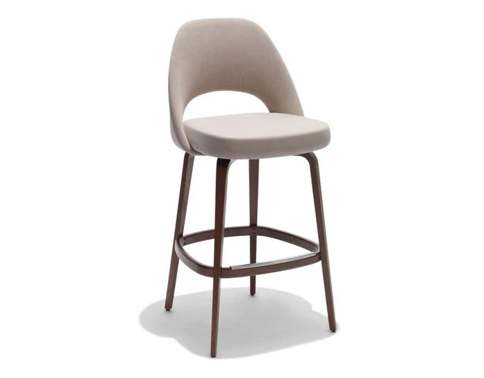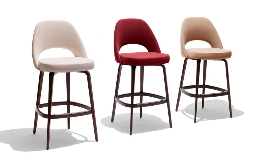 The Saarinen Executive stools feature a molded reinforced polyurethane back shell with a contoured plywood seat form. The wood legs are solid, steam-bent oak. The foot ring has a cast aluminum foot cap to protect the wood. Includes nylon glides with stamped steel shroud.