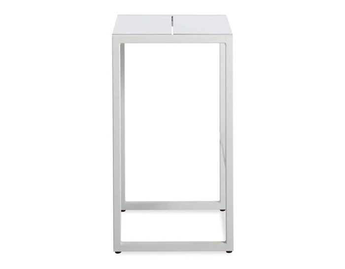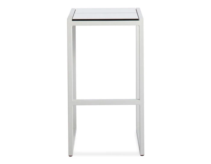 Modern outdoor barstool designed for the outdoors. Crisp, minimal white powder-coated aluminum and solid laminate top. The entire Skiff collection offers clean lines designed to weather the elements.