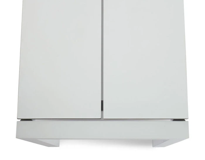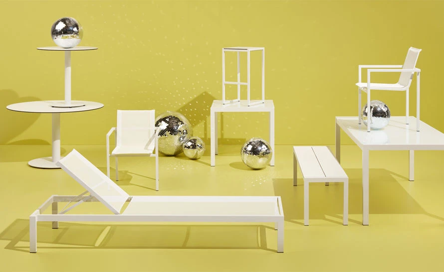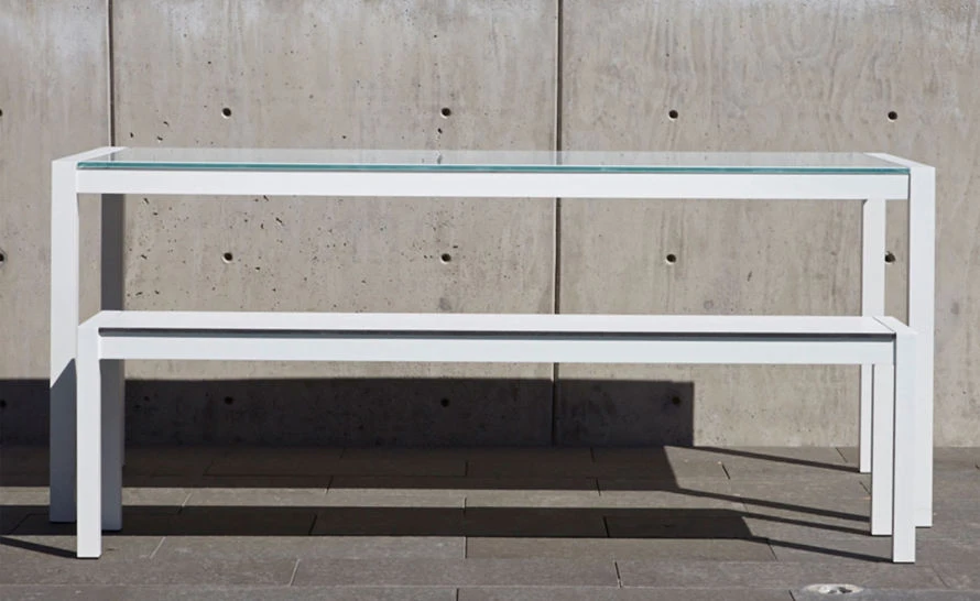 Modern outdoor bench designed with crisp minimal white powder-coated aluminum and solid laminate top. The entire Skiff collection offers clean lines designed to weather the elements.