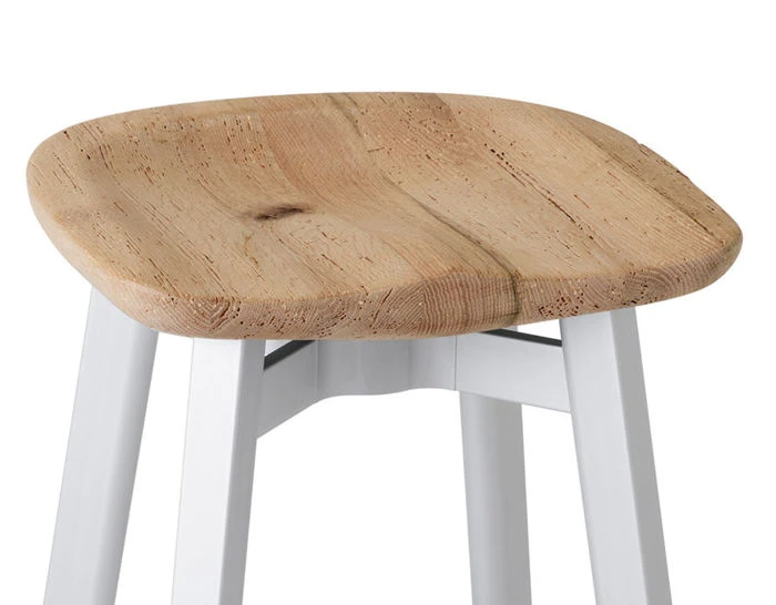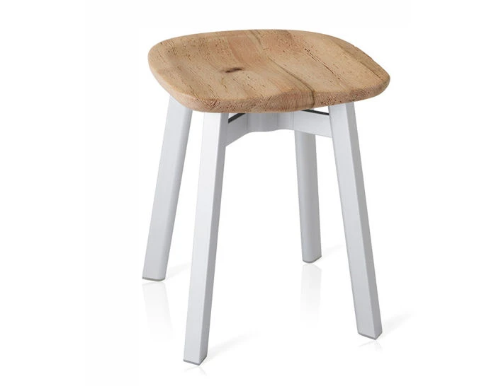 The Su small stool is offered with either a wood base or anodized aluminum base in natural or black. Plastic seat stools with aluminum legs are suitable for outdoor use. Each stool includes soft plastic (TPU) glides. Optional formed seat pads can be specified in recycled PET with top surface in felt. The seat pad is formed to match the Su stools, which have the iconic seat form used on Emeco chairs since 1944.