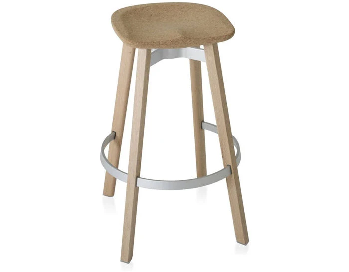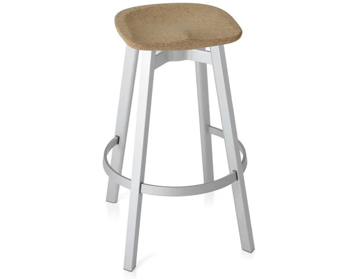 The Su stool is offered in two heights with either a wood base or anodized aluminum base in natural or black. Plastic seat stools with aluminum legs are suitable for outdoor use. Each stool includes soft plastic (TPU) glides. Optional formed seat pads can be specified in recycled PET with top surface in felt. The seat pad is formed to match the Su stools, which have the iconic seat form used on Emeco chairs since 1944.