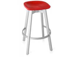 The Su stool is offered in two heights with either a wood base or anodized aluminum base in natural or black. Plastic seat stools with aluminum legs are suitable for outdoor use. Each stool includes soft plastic (TPU) glides. Optional formed seat pads can be specified in recycled PET with top surface in felt. The seat pad is formed to match the Su stools, which have the iconic seat form used on Emeco chairs since 1944.