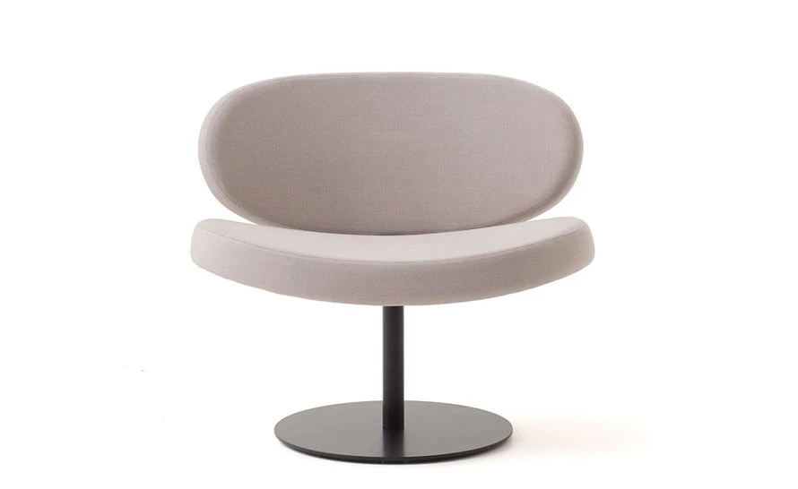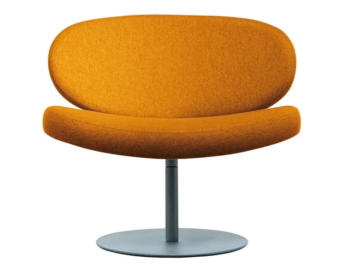 Sunset is a swivel armchair with a satin stainless steel base with seat and back in bent birch plywood, padding in polyurethane foam. Fixed cover is offered in a variety of fabrics or leathers.