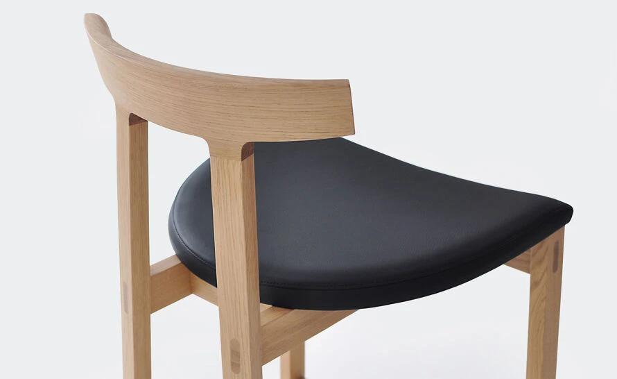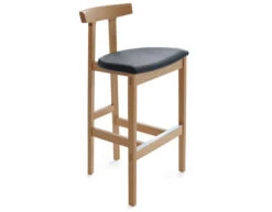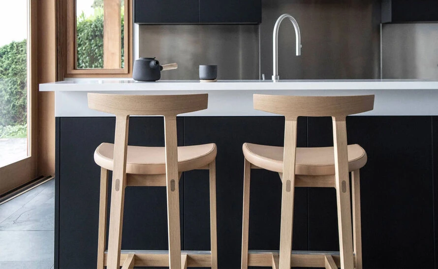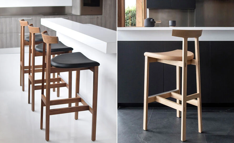 Torii is constructed using traditional exposed mortise and tenon joinery for the legs which is strong and expresses the honest intent of the design. The arched back rest is cleverly joined to each back leg ensuring the critical joint will not fail or crack, while keeping the material thin and light. The finish is an advanced low build water-based polyurethane that gives the wood a natural open-grain appearance, which is smooth to the touch and durable. A solid aluminum foot rail protects the wood frame. Torii stool is available in two heights in your choice of White Oak, Black stained Ash, and Walnut, with leather or fabric upholstered seat.