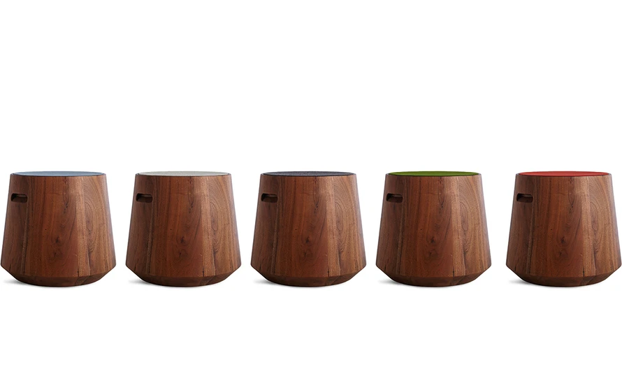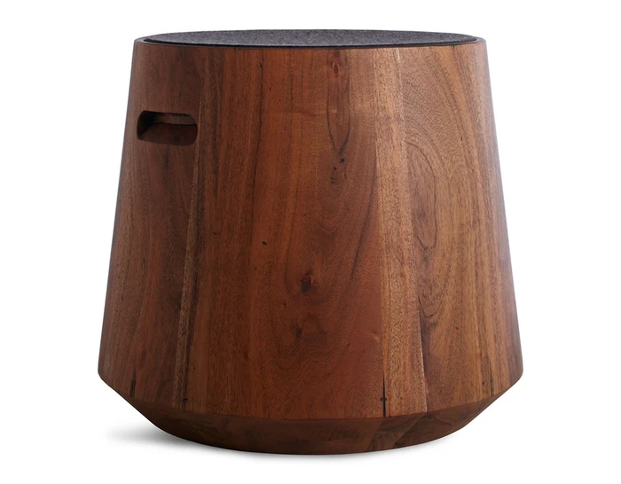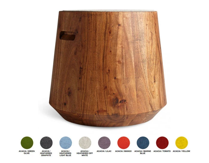 Solid Acacia wood topped with the thick cut wool felt top of your choice in a variety of fashion colors to suit your decor or mood. The Turn Stool features cut out handles that invite easy relocation for use as spontaneous seating, side table or an ottoman.