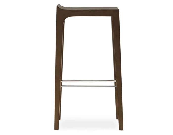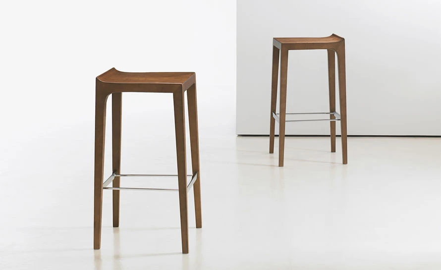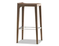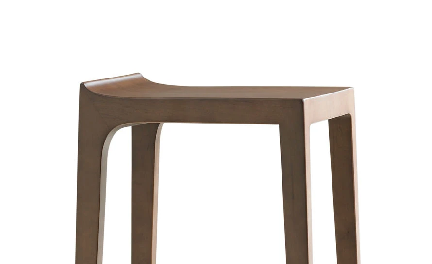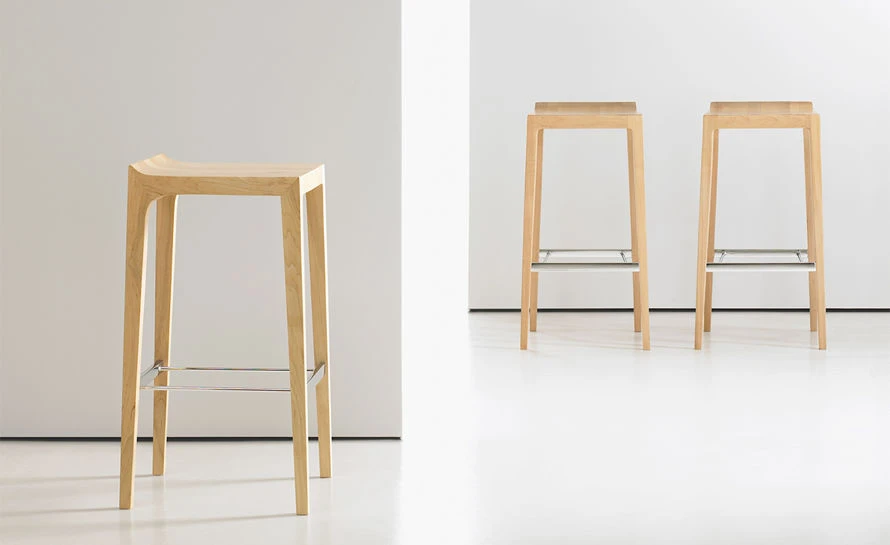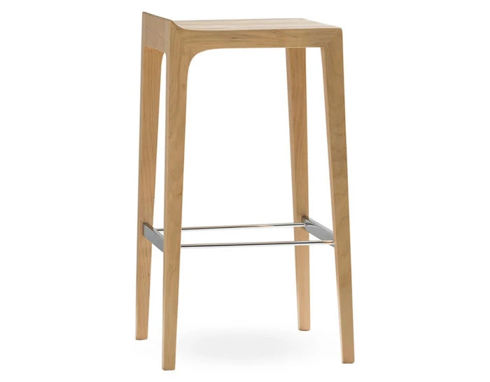 The Vanish stool was inspired by the beauty of serif typefaces, each vertical line is angled slightly to create a slim, but sturdy stool. Vanish stool features a solid maple frame with a chrome plated steel stretcher guard. Vanish is only offered in bar height.