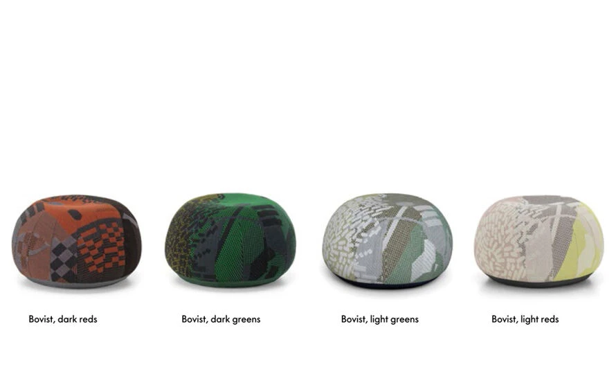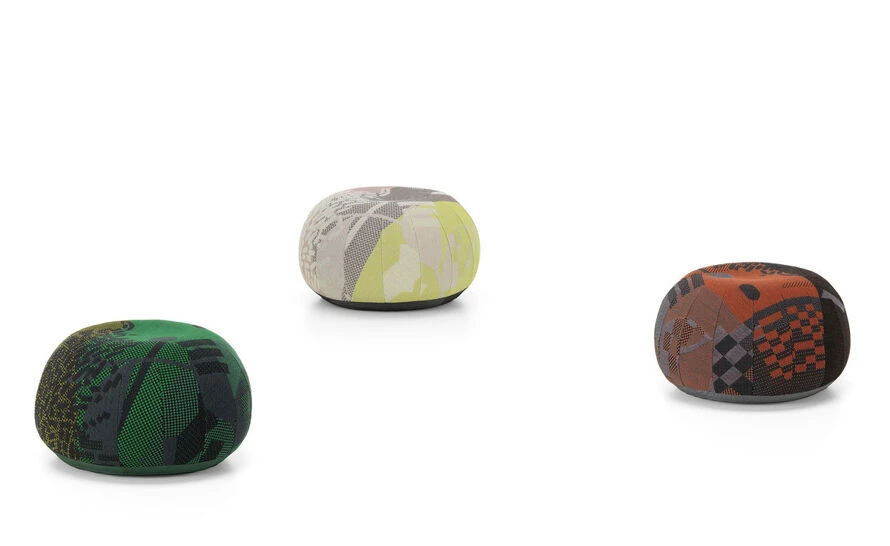 Bovist is a decorative floor cushion, stool, and ottoman all in one. Its compact, round shape is reminiscent of a puffball (Bovist in German). It offers a high degree of seating comfort and stability with a filling of small plastic balls. Large sections of embroidery give the cover, which consists of different colored fabrics, a particular charm and there is a knitted thread handle for moving Bovist to different places in the home.