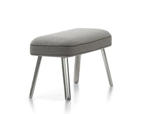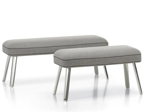 The upholstered Panchina bench can be used as a simple, universal seating possibility or as a matching ottoman to Repos and Grand Repos. Panchina is available in a variety of leathers and fabrics, with decorative seams that lend the chair a distinctly contemporary, almost technical flair. The die-cast aluminum legs include hard plastic glides and can be specified in your choice of polished or colored lacquer versions.