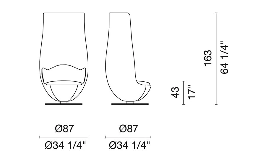 A sculptural presence makes the Wanders’ Tulip Armchair an exceptional protagonist in any setting: ideal in spacious areas, both contract and private, thanks to the eye-catching elongated blossom shape and upbeat, cheerful appeal. A re-visitation of the classic armchair, with elongated oversized proportions, Wanders’ Tulip Armchair has a shell made of fiberglass and resin; padded with soft and firm polyurethane foam; the fixed cover is available in a vast array of fabrics and leathers. The calyx shape of the armchair evokes the silhouette of a flower resting on a brilliant swiveling metal base, varnished with natural aluminum.