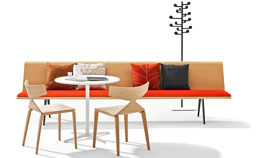 Graphic, lightweight and fluid, Zinta is a modular sofa system defined by the harmonious juxtaposition of smooth lines and warm materials. Its deep seat perfectly supports the casual recline of the body. Its system of variable lengths and gentle angles allows it to weave through a space with subtle dexterity. It can serve as simple, single sofa or large-scale organizing principle in an open space.